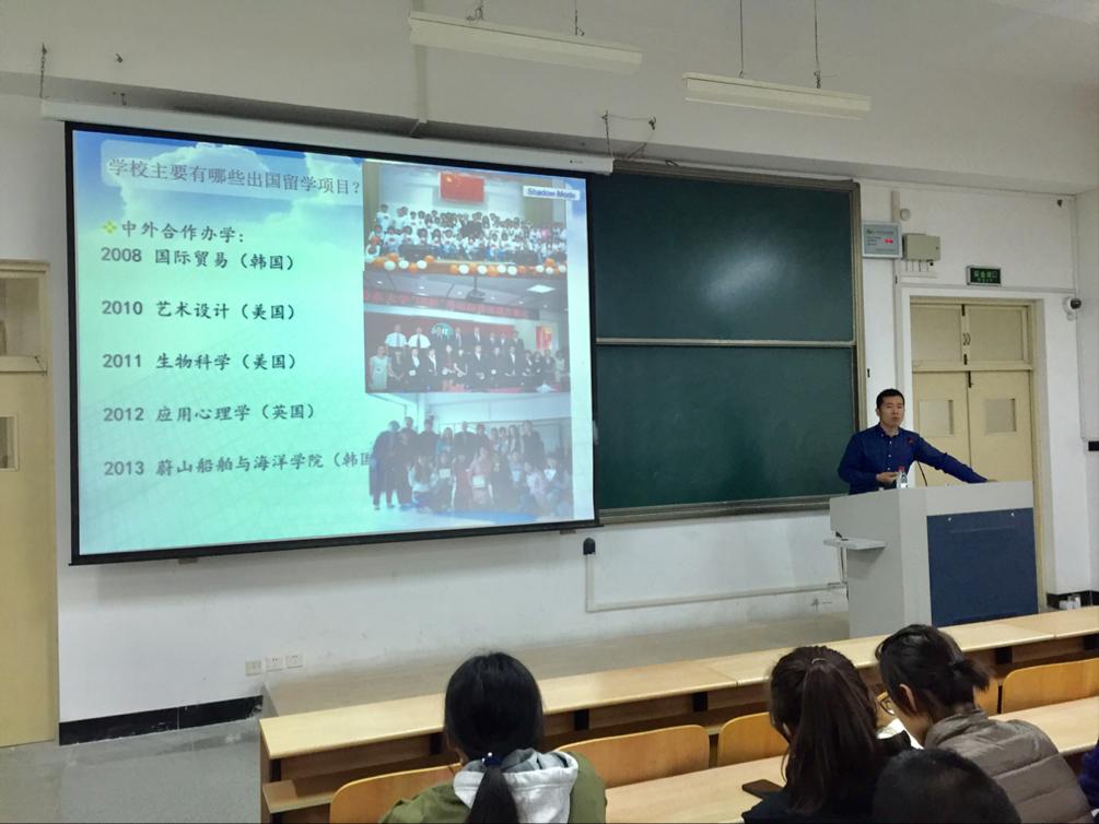 为了开阔同学们的国际视野,更好地规划大学生活,学院于10月28日晚在南区四号教学楼419多媒体教室举办了2018级新生入学高等教育国际化与出国留学知识普及讲座,鲁东大学国际交流与合作处副处长吴道迅老师担任主讲人。