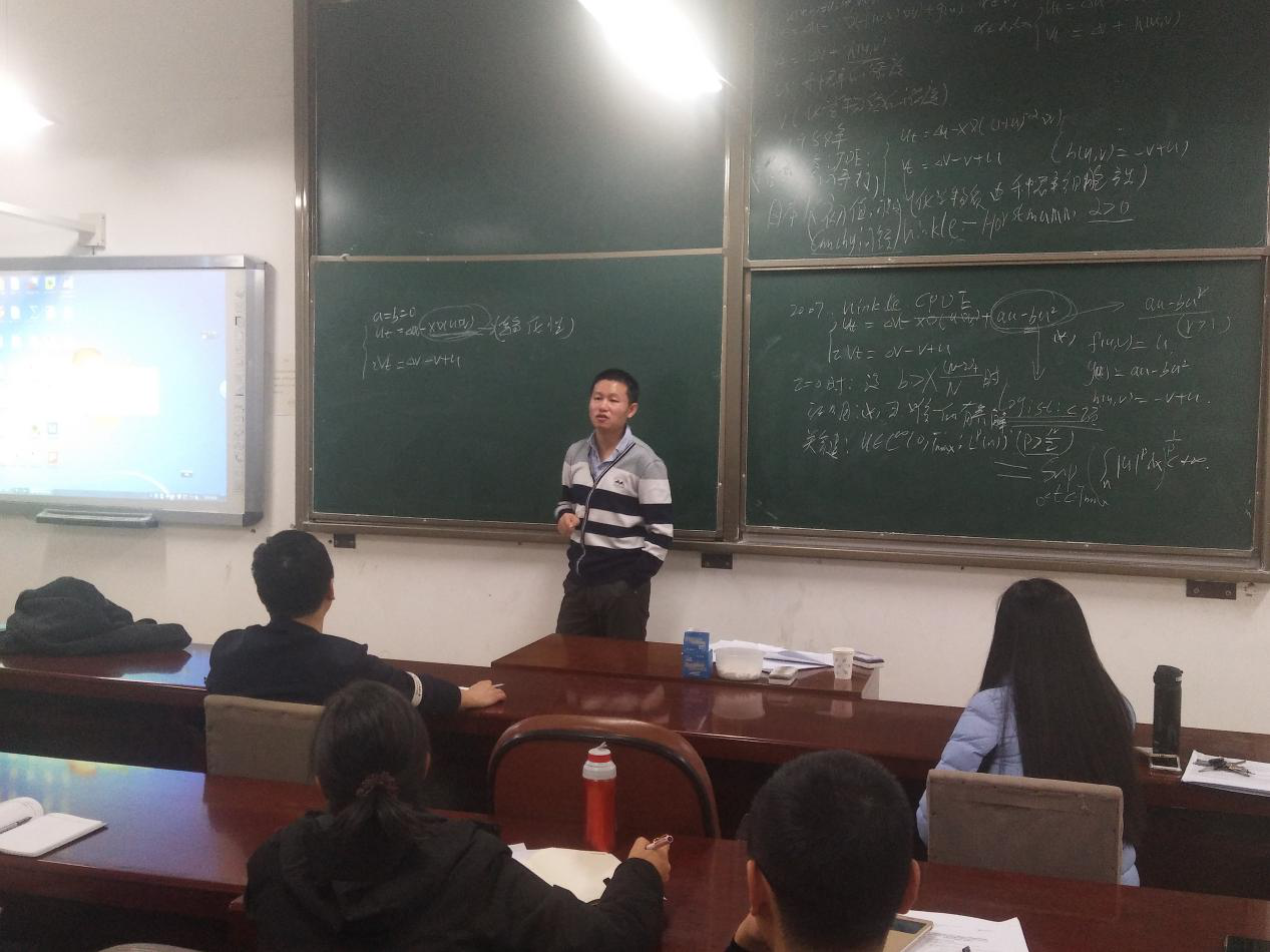 12月5日晚上,学院郑甲山老师于南四412室开展了一场题为“奇异灵敏度和logistic项的高维Keller--Segel系统解的有界性和大时间渐进性”的精彩学术报告。学院部分老师和全体微分方程及其应用专业硕士研究生参加了本次报告会。