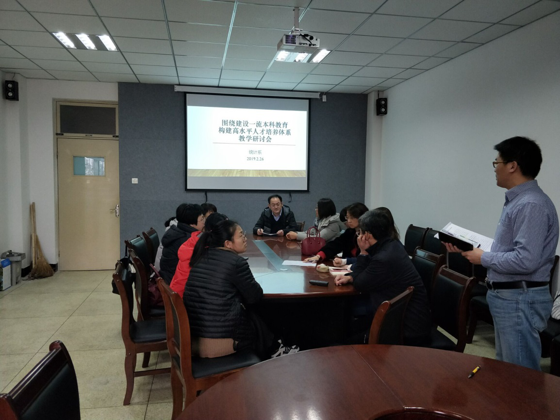 2019年2月26日下午,统计系全体教师在309会议室,集体学习了学校教务处文件《围绕建设一流本科教育,构建高水平人才培养体系》。