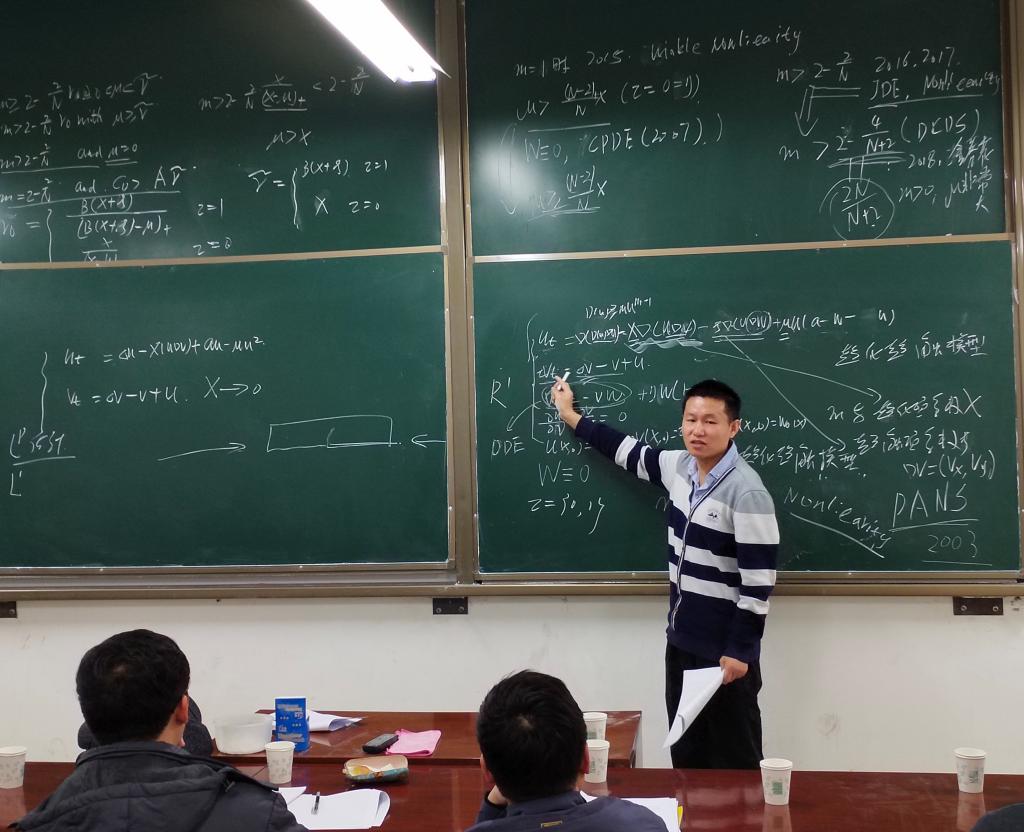 2019年3月28日晚上6:30,学院应用数学研究中心郑甲山老师于南四教学楼412教室作了题为“A new (and optimal) result for boundedness of solution of a quasilinear chemotaxis--haptotaxis model (with logistic source)”的精彩学术报告。学院部分老师和全体微分方程及其应用专业硕士研究生参加了本次报告会。