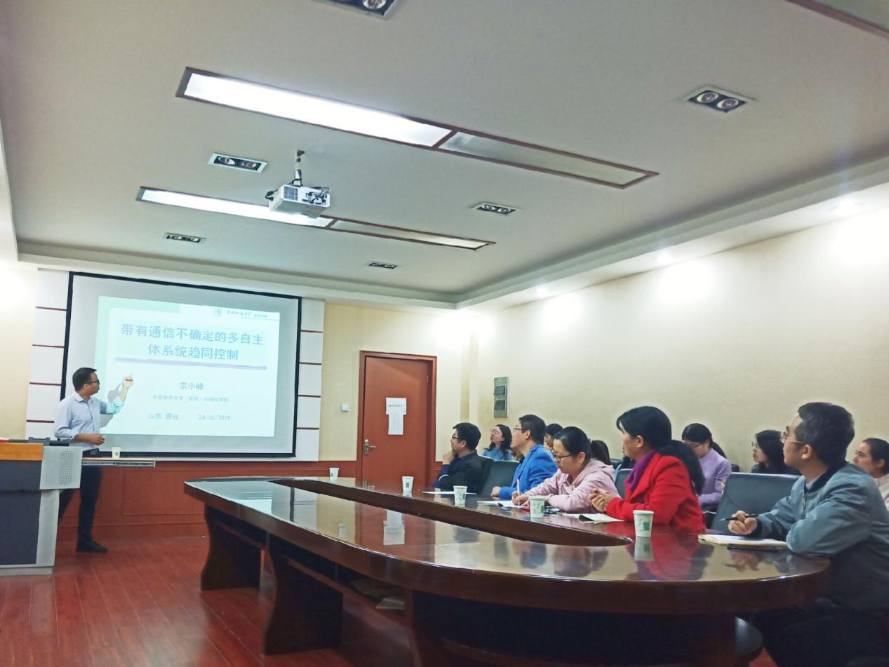 2019年10月24日,学院邀请中国地质大学(武汉)教授、博导、副院长宗小峰,在南四教学楼411报告厅,开展了一场题目为“Consensus Control of Multi-agent Systems with Communication Uncertainties”的学术报告。本次报告会由学院智能控制中心主任李武全老师主持,中心副主任高荣老师以及中心部分老师和全体研究生参加了报告会。