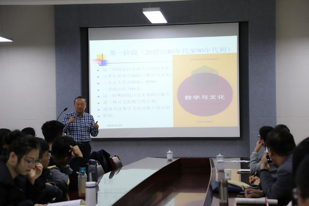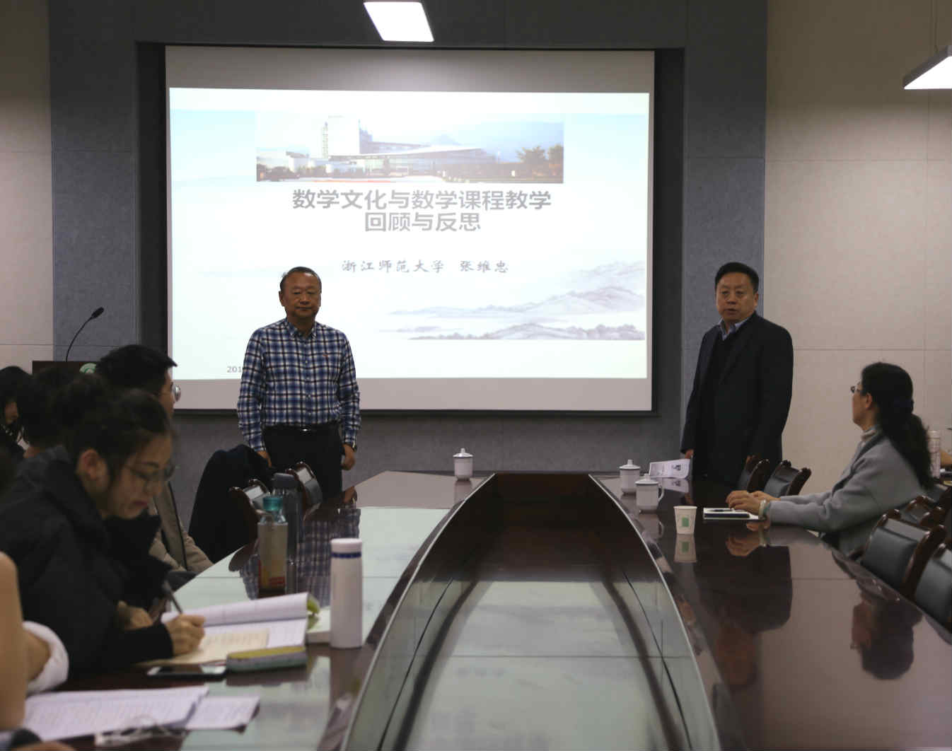 2019年11月14日,浙江师范大学教授、博士生导师张维忠教授莅临我院,于南四教学楼306会议室,开展了一场题为“数学文化与数学课程教学回顾与反思”的精彩学术报告。刘晓华教授主持了本次会议,学院部分教师以及研究生和本科生到场听取报告。