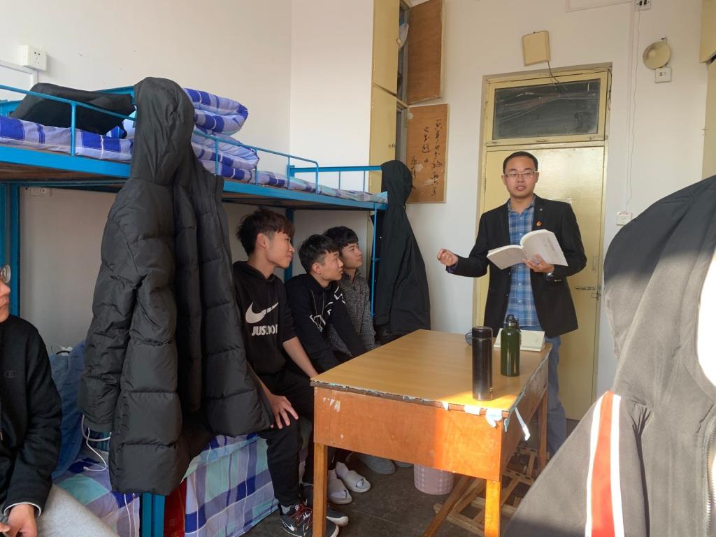 学院团总支刘德康老师深入北区七号宿舍楼415宿舍,与同学们共同赏读《习近平讲故事》,415宿舍的任天硕同学很喜欢其中的“革命青春”一篇,他谈了读后的感悟,并朗诵了一段他最喜欢的话。刘老师结合自身的求学经历,谈到个人的命运和国家命运紧紧相连,希望同学们以振兴中华为使命,以国家富强为己任,珍惜当下的幸福生活,并鼓励大家要广读书、深读书,励志成为一名有知识有素养的综合型人才。另外,刘老师鼓励大家充分发挥团员先锋模范作用、优秀学生的榜样作用,带动宿舍的学习氛围。