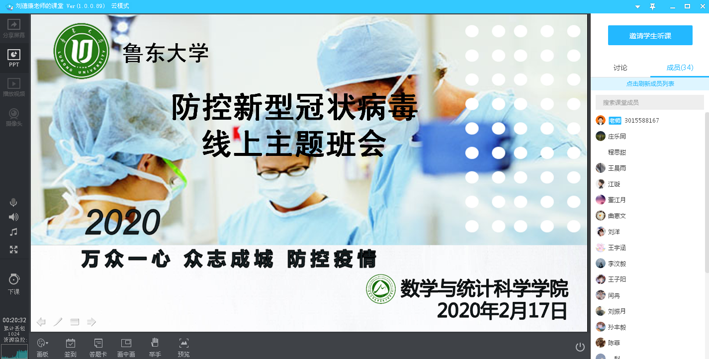 为进一步贯彻落实学校关于防控新冠病毒工作要求,增强学生疫情防控意识,推进“停课不停学”工作顺利开展,学院于2月17日利用腾讯课堂召开防控新冠病毒及网课学习动员线上班会,全力以赴做好疫情防控工作。