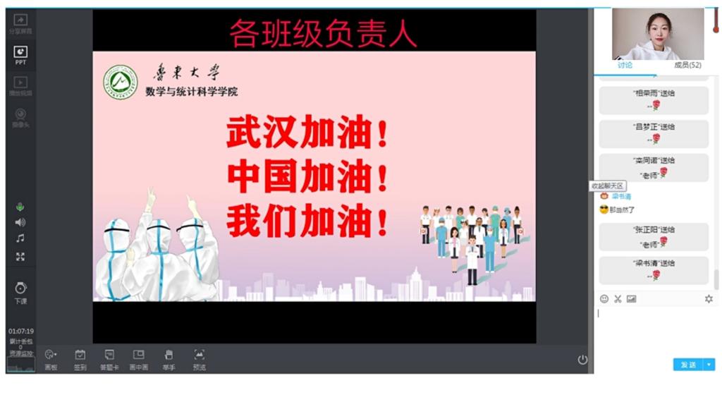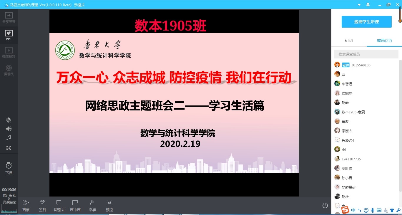 辅导员老师们利用腾讯课堂进行网络思政,首先召集全院班级负责人进入课堂,线上利用ppt、视频等方式宣讲,将本次思政内容传授给学生骨干。课后由学生骨干通过网络班会的形式,传达到每个同学。本次班会首先通过观看新型冠状病毒感染的肺炎防控宣传视频,开展健康教育,引导学生做好居家及外出防控。其次,做好学生的思想工作,引导学生遵纪守法、听从指挥,做到“学校不通知不返校”。最后,班会从学生寒假期间的生活、学习、休闲等3个方面引导学生树立正确的防疫心态,读书修身、学习报国,夯实专业基础,丰富知识储备,做到“停课不停学”,主动承担时代赋予的使命和责任。