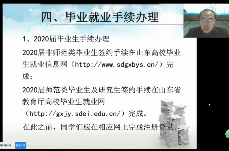 2月27日,学校发布了《致鲁东大学2020届全体毕业生的一封信》,为了促进2020届毕业生对新冠肺炎疫情影响下的就业形势以及学校就业政策的深入了解,学院辅导员刘德康老师利用钉钉群直播为毕业生进行视频解读。