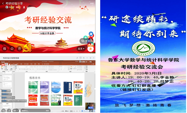 为充分发挥优秀学生党员的先锋模范作用,增强同学们考研信心,3月1日,学院学生党支部利用钉钉系统群直播功能举行了“先锋模范党员考研经验交流会”。本次交流会由学院辅导员刘德康老师主持,学生党支部党员李金静、吕梦正依次向大家做经验交流分享,2017级、2018级、2019级各专业有志于考研的460余名同学参加了交流会。