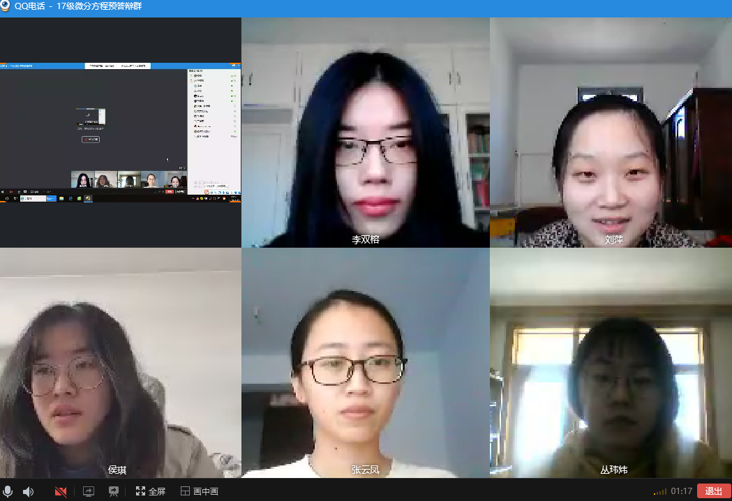 根据教育部、山东省教育厅和学校有关通知精神,为进一步做好新型冠状病毒感染的肺炎疫情防控工作,学院成功举行2018级学科教学(数学)和2017级微分方程及其应用方向专业研究生学位论文线上预答辩。预答辩委员会主席分别由刘晓华教授、魏新江教授和沈春教授担任,委员包括翟金刚、樊永红、孙梅娜、龙晓瀚、王琳琳、方爱丽、樊保强、程学汉、于海生、郑甲山、候小华等老师,张敏老师任预答辩秘书。