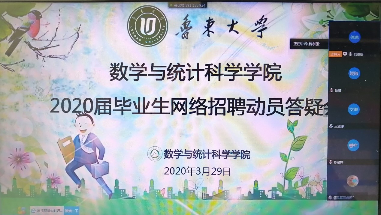 为了帮助2020届毕业生认清当前就业形势,积极做好就业准备,把握网络招聘就业机会,学院于3月29日下午通过线上会议的形式召开毕业生网络招聘动员会。本次动员答疑会由刘德康老师担任主讲人,2020届所有研究生和部分本科生参加。
