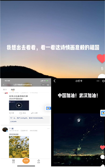 3月20日起,学院通过QQ“小打卡”小程序开展“打卡·爱”活动,鼓励同学们通过短视频、图片、文字等形式记录居家学习生活,思考疫情结束后最想做的事,表达对未来生活的美好向往。