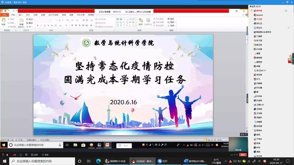 为增强同学们的疫情防控意识,阻止新型冠状病毒的进一步传播,帮助学生度过居家复习的特殊时期,我院各班于本周开展了“坚持常态化疫情防控,圆满完成本学期学习任务”线上主题班会。