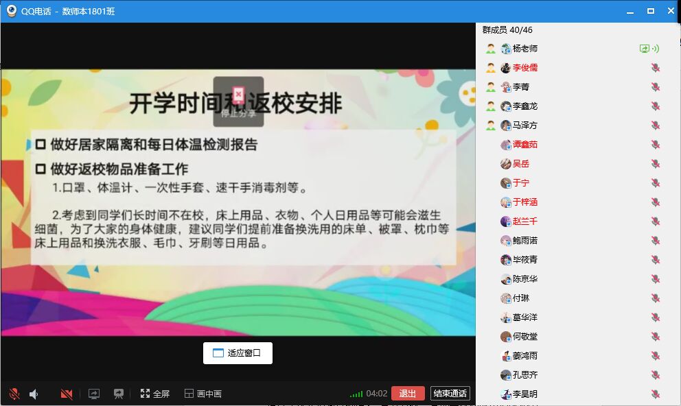 2020年“超长版”寒假终于结束,班主任根据所带班级实际情况,利用QQ群、腾讯课堂等直播网络平台,给同学们开展开学时间和返校安排的主题班会,将上级部门和学校关于开学返校过程中做好疫情防控的文件精神传达给每一位学生。