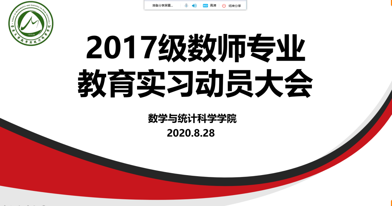 为确保2017级公费师范生顺利高效地开展实习工作,我院于8月28日晚在线上召开2017级数师专业教育实习动员大会,会议由数学与应用数学系主任樊保强老师、副主任胡鑫老师、程学汉副教授、龙晓瀚副教授出席本次大会,会议由胡鑫老师主持。
