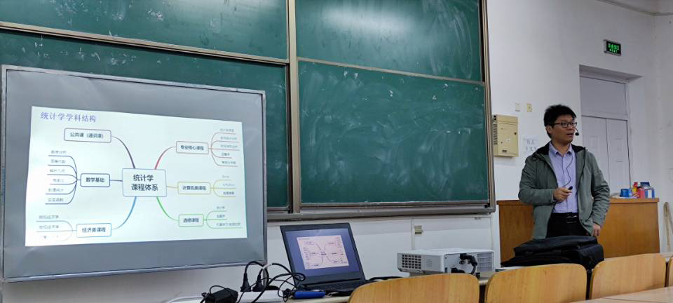刘广臣首先为同学们介绍了统计学的分类及发展历史,指出统计学是横跨社会科学和自然科学领域的多样性科学,又从出国、就业、考研三个方面分析统计学当前现状和发展前景;接下来,李娟老师展示了历届学生的在校表现情况,建议同学们合理规划未来发展。最后王敏寄语新生“花可重开旧日枝,人无再返少年时。劝君岁月休辜负,莫待白头悔悟迟”,勉励同学们脚踏实地、抓住优良的学习资源认真学习基础知识,不断登上更高的舞台。