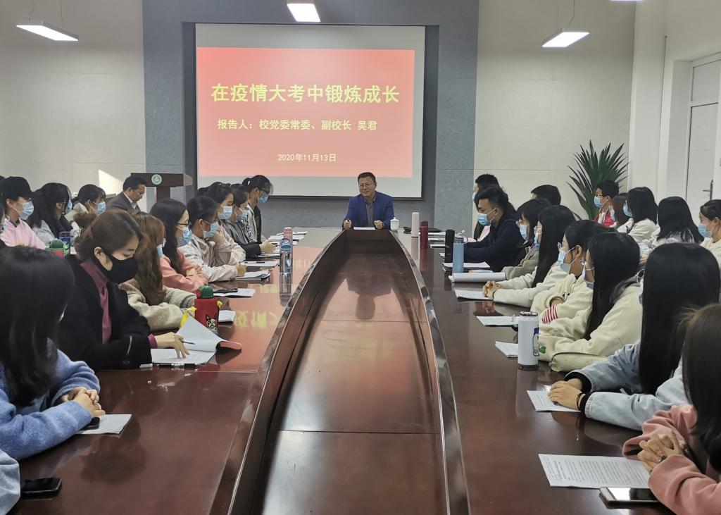 11月13日下午,校党委常委、副校长吴君到我院给大学生上题为《在疫情大考中锻炼成长》的思政课。学院负责同志、学生干部代表及部分入党积极分子参加听课。