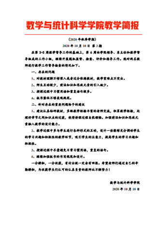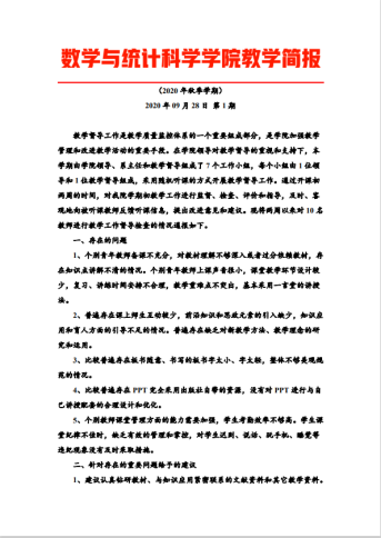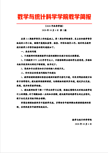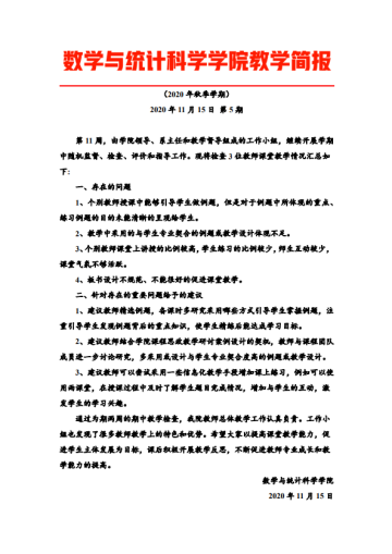 在完成学期前三周的教学监督、检查、评价和指导的基础上,学院又开展了第10-11周期中教学检查工作。听课当天即向授课教师反馈听课意见,在教学态度、教学内容、教学方法、课程思政、信息化教学、教学效果等多方面对授课教师予以评价,及时指出教师教学中存在的问题,给予教师有针对性的建议。促进指导教师不断提高教学艺术、激发学生学习兴趣、提高课堂教学质量。教学检查一周一总结,每周形成一期《教学简报》,使全院教师能够及时了解教学监督、检查的进度,及时了解课堂教学中存在的问题和指导反馈建议,不断激励教师重视课堂教学,推进课程思政建设,构建全员全程全方位育人大格局。