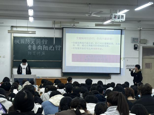 讲座由石祥瑞、徐贾伟两位同学主讲。首先,他们结合校园生活场景,根据现阶段我国学生HIV感染者的数据,强调学习校园防艾相关知识的必要性和重要性。随后,两位主讲人向同学们科普了艾滋病核心知识,包括艾滋病的传播途径、感染条件、预防措施以及检测与治疗的相关信息。在互动环节,针对同学们提出来的有关艾滋病防治问题,主讲人进行了答疑解惑,同学们再次巩固了相关知识。最后,两位主讲人提倡给予艾滋病患者社会关怀与尊重,用真诚的关怀温暖每一位艾滋病患者,共筑包容友善的社会环境。
