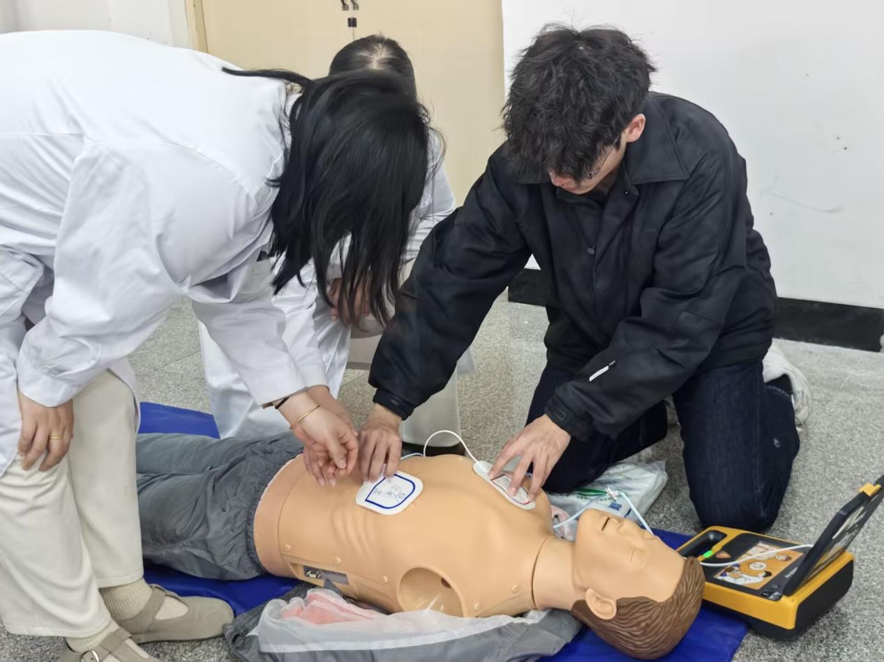 本次培训特邀专业医师担任主讲,采用“理论讲授+实操演练+互动答疑”三位一体的教学模式。在理论环节,医师系统梳理了心脏骤停识别、应急救护流程及AED工作原理等核心知识,重点强调了“黄金四分钟”内实施急救的关键意义;在实操演示环节,医师借助专业模拟人,完整演示了从现场安全评估、拨打急救电话到心肺复苏(CPR)、电极片贴附及AED除颤的全流程操作,直观展现了AED设备“开机即指导、傻瓜式操作”的便捷特性。培训特别设置沉浸式实操环节。两名学生在医师一对一指导下,严格遵循“评估-呼救-按压-除颤-交接”的标准化急救链条,依次完成环境安全确认、120报警、胸外按压、AED开机自检、电极片粘贴及电击除颤等关键步骤。现场学员全程观摩记录,医师即时纠正操作细节,针对按压深度、频率及电极片贴附位置等要点进行精准指导,确保每位学员掌握规范动作。